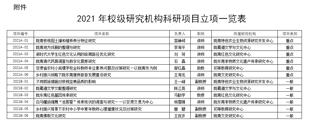 8月30日,学校下发文件《关于2021年校级研究机构科研项目立项的通知》(校发〔2021〕58号),立项12个2021年校级研究机构科研项目。其中重点项目6项,每项资助项目经费1.5万元、一般项目6项,每项资助项目经费 1 万元。陇蜀道文学与文化研究中心研究员李海平老师主持申报的《陇南地方戏剧的整理与研究》获批重点项目,陈江英老师主持申报的《陇蜀道文学文献整理研究》获批一般项目。
